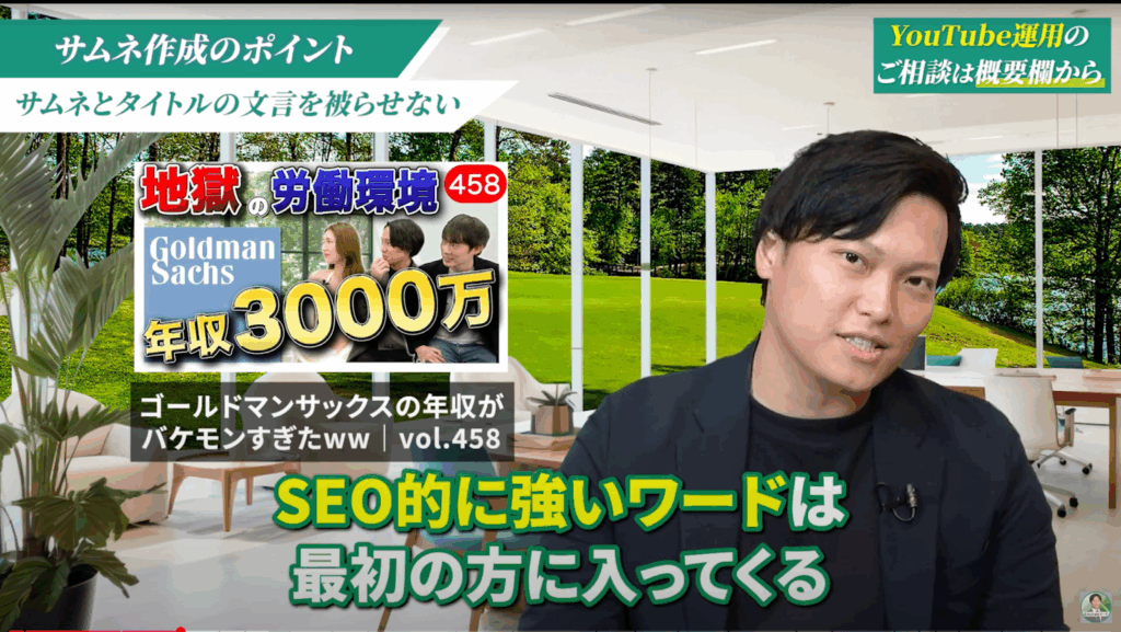 サムネイル:「地獄の労働環境・年収3000万」→直感的なインパクトで興味を引く