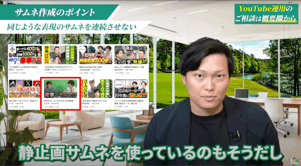 サムネイルで視聴者の注意を引くためには、視覚的な差をつくることが重要です。