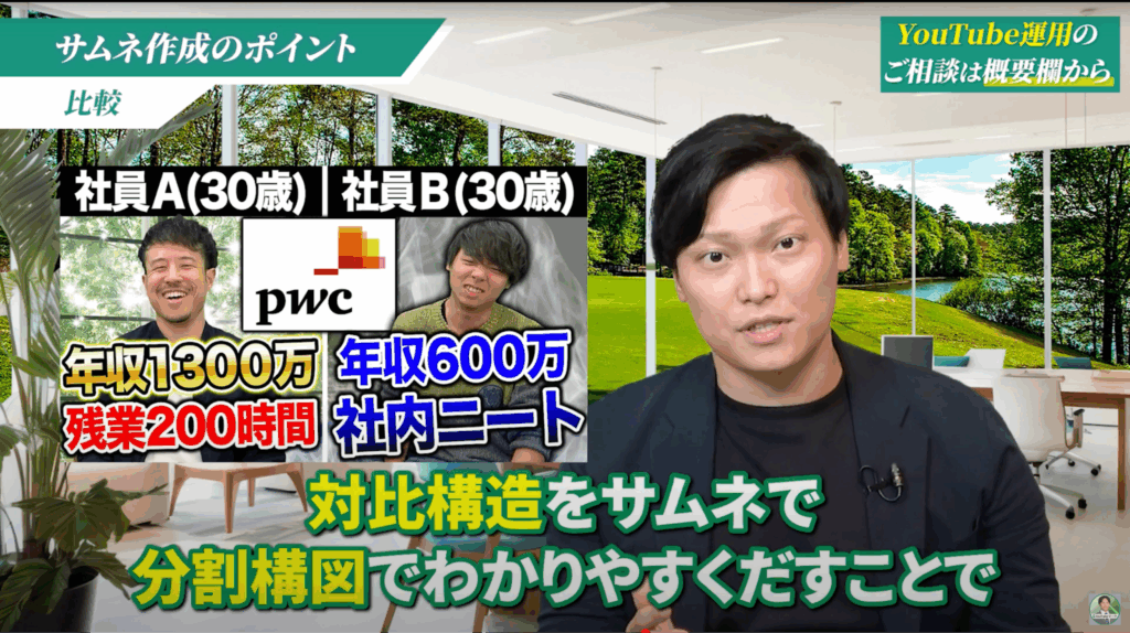 「外資コンサルで結果を出せないとどうなる?」という動画では、サムネイルを左右に分け、左側に「成功した人」、右側に「失敗した人」を配置しています。